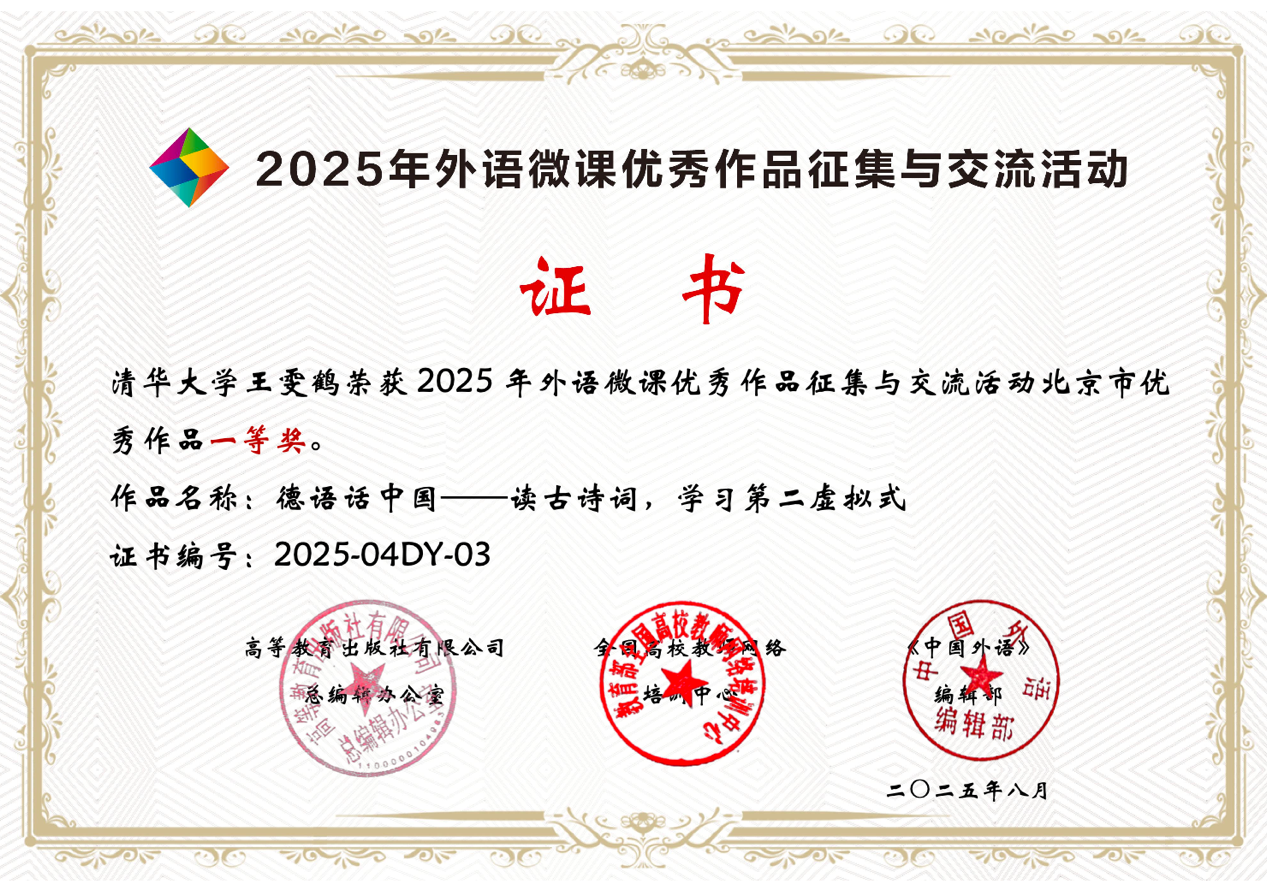 近日,由高等教育出版社、全国高校教师网络培训中心和《中国外语》编辑部联合举办的“2025年外语微课优秀作品征集与交流活动”公布了省级优秀作品名单,清华大学语言中心教师王雯鹤提交的德语(第二外语)微课作品“德语话中国─读古诗词,学习第二虚拟式”荣获省级(北京市)优秀作品一等奖。